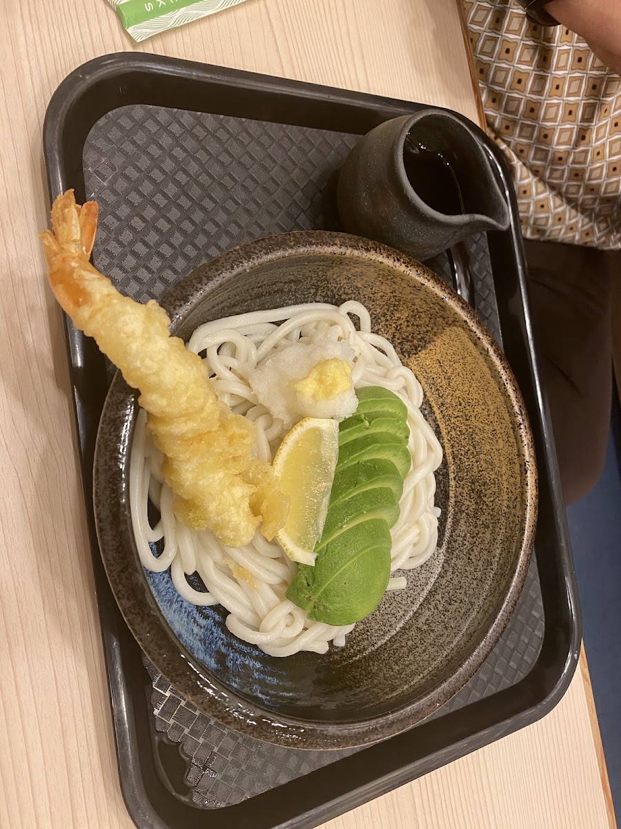Super happy with the experience and food here! Ambience: Super cute, clean small shop with friendly workers, very reminiscent of Tokyo shops. Very easy to park with parking lot right outside. It is kind of a weird service model. They brought us a menu but we had to go up to order and pick up our own food and put our own tray away. Food: We decided to share a bowl since we had just eaten at Ono poke & we were so full but after we finished we wish we had more because it was so good!! We got the regular size cold udon that has chicken tempura, grated daikon, lemon, and green onion and a side of shrimp tempura. The noodles were nice and thick and had chew without being too soft. It was our first time trying cold udon and it was so refreshing. The broth you pour on top was nice and cold and had good flavour that coated the noodles well. The lemon added a nice refreshing zing to it. Tempura: they were made fresh to order so it took a bit of time, but they were both hot and crispy and a great contrast to the cold udon. The chicken tempura was white meat but it was so juicy!!! Although it was lacking flavour. Definitely had to dip it in the sauce otherwise it was too plain. Shrimp was delicious although small. Overall if you were to compare to Marugame, I’d say this shop is a higher quality & more authentic udon shop with a wider variety of options however it is a bit more expensive and would take longer to prepare. I do think they need to change their service style and decide what kind of restaurant they want to be (quick fast food or formal sit down service).